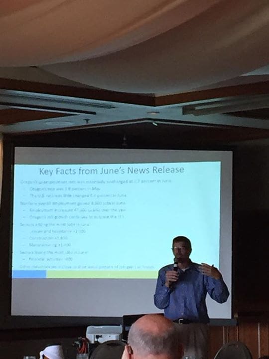 Guy Tauer from Oregon employment office presented info on area economics. The unemployment rate in Jackson county was 3.6 percent in may 2017. The 16-24 year old group remains the group that struggles to become employed.